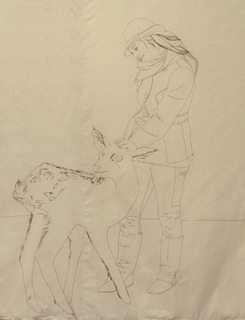 Priča o Bambiju interpretirana je kroz figurativni crtež, svojevrsni autoportret. Na platnu, ovdje u funkciji crtačke podloge, linearnim crtežom izraženim kroz šivani trag konca, prikazana je žena (autoportret) koja nježno dotiče malo lane. Žena i lane prikazani su u nedefiniranom interijeru koji je popločen gotovo nevidljivim ornamentom bijelih ruža po zidnim oblogama (Slika 56). Ukupno 365 ruža sustavno je šivano godinu dana, svaka ruža ekvivalent je pojedinom danu te simbolizira nevidljivi majčin rad, majčinsku praksu i emocionalni angažman koji majka svakodnevno, odnosno kroz prvu godinu djetetova života, uputi djetetu i koji se od nje očekuje.