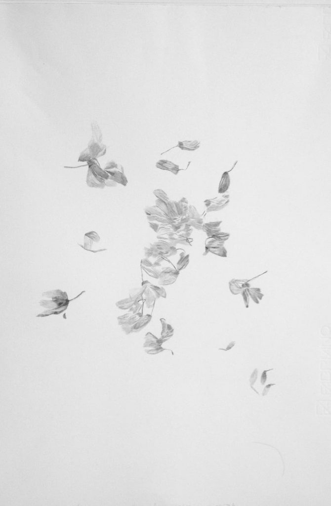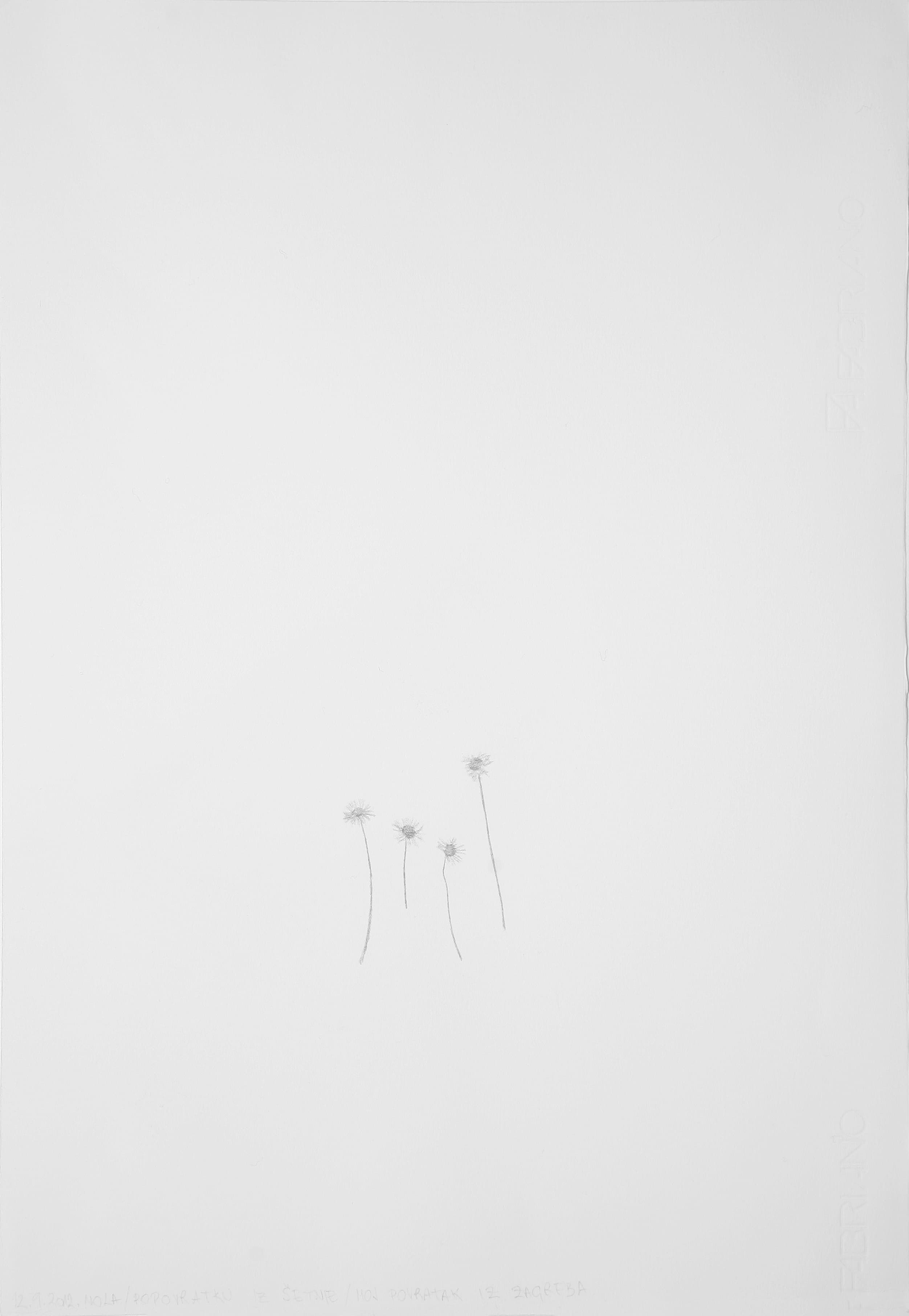 Mom is going to Zagreb – Archive of Encounters is expressed in the form of a drawing map, which consists of tonal studies of objects which I have received as presents from the children Drawings are made approximately in scale 1:1, according to the template. This type of presentation has demonstrated it’s advantage over photography and material archive, conisdering that some presents have begun to rot and to decay, and the amateur herbarium scattered all over the library has begun to dwindle. Fragileness of this object is expressed through achromatism of tonal drawing studies, with a minimally stressed contrast of light and dark tones. Currently, map contains thirty drawings that are classified, numbered, and labelled appropriately in terms of when and where the encounter has occured.