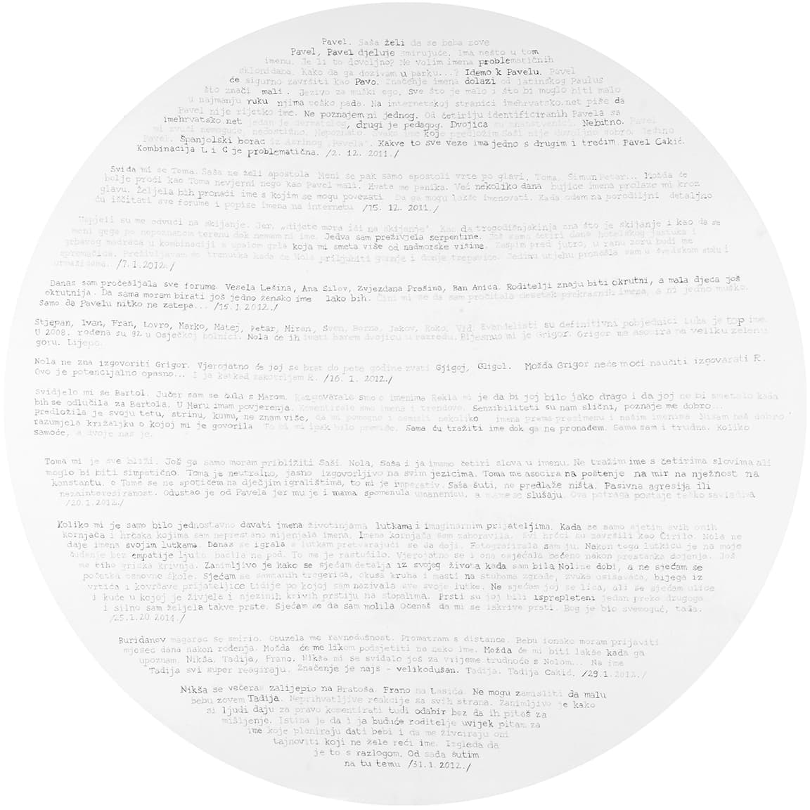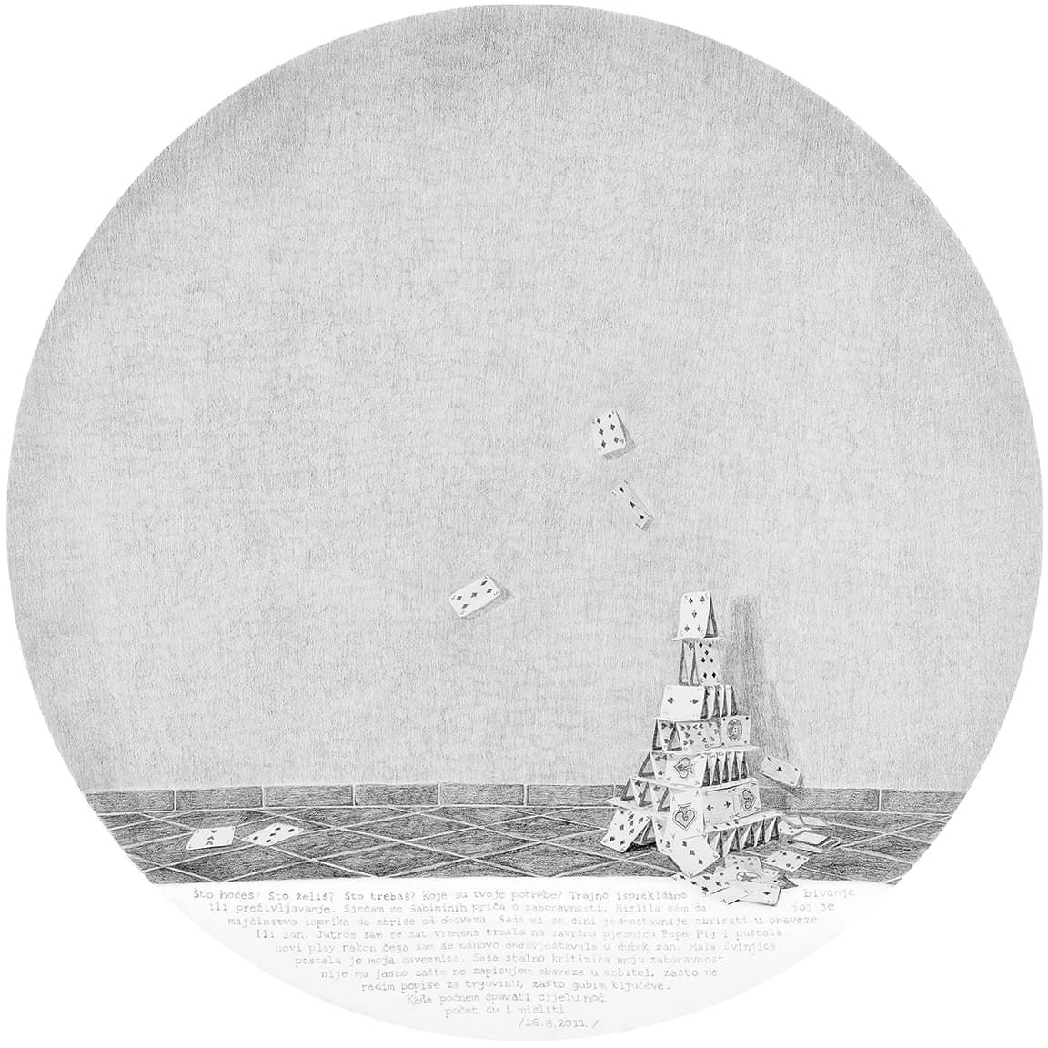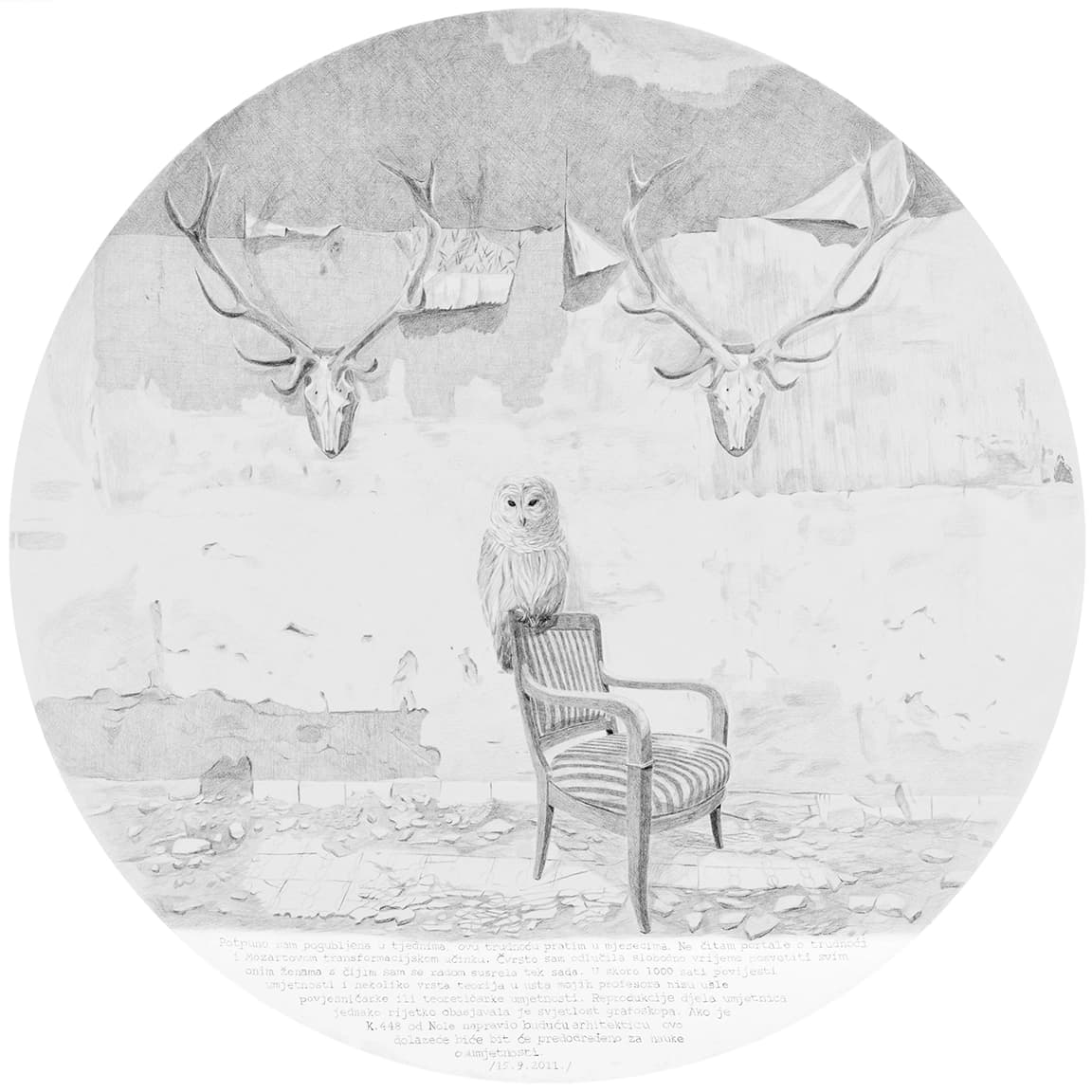 Opet možda preuzetno, čini mi se da je, koliko god svako od prethodnih izlaganja bilo precizno, temeljito, promišljeno i konačno ostvareno kao konkretna umjetnička praksa u svakom od medijskih izbora, ovaj ciklus pod nazivom Matriksijalne priče do sada vjerojatno najopsežniji i najcjelovitiji slikarski projekt u koji se ova umjetnica upustila. Čak ako ostavimo po strani činjenicu da je to dio njezine doktorske teze, a što znači da je u projekt uloženo mnogo od znanstvenih metodologija, koncept izložbe kristalno je jasan u svojoj umjetničkoj čistoći i samostalnosti. Ako samo malo i posve indiskretno zavirimo u naslove poglavlja kojima je pripremala završna i izvedbena rješenja svoje prakse, poput Osobno razumijevanje subjektivnosti majčinstva u susretu s umjetničkom praksom, Osvrt na radove Bez naziva – rad posvećen Noli i Imaginarni bestijarij, Prema Matriksijalnim pričama, Majčino mišljenje i njezino tijelo, Likovna koncepcija, Interpretacija crteža i potom nazivi devet crteža koji su sadržaj ove izložbe, jednake veličine – rundeli promjera 140 cm, u tehnici olovke na bijeloj podlozi te naziva 1. Iščekivanje, 2. Prekid, 3. Identitet, 4. Kontrola, 5. Ljubav, 6.Identifikacija 7. Oblik, 8. Ime i 9. Razdvajanje, jasno je u koliko je složen i zahtjeva projekt ušla umjetnica. Ima smisla i razloga opet se pozvati na riječi umjetnice kako bi njezine misli, u riječi, ali i slici, potvrdile svoju neupitnu jasnoću: „Kroz radove Bez naziva – rad posvećen Noli, Imaginarnom bestijariju i Matriksijalnim pričama prevladala sam prisutnost osjećaja stida da kroz vlastiti umjetnički rad subjektivno prikažem vlastito iskustvo kroz prizmu umjetnice – promatračice, u susretu s majčinstvom i trudnoćom potaknula me je na promišljanje o procesu vlastitog transformiranja kroz trudnoću i majčinstvo, a s time i o mogućnostima za transformiranje moje umjetničke prakse koja se otvorila prema istraživanju subjektivnog iskustva majčinstva koje sam izrazila u Matriksijalnim pričama. Ovaj crtački poliptih izražen je u svojevrsnoj formi grafičke novele koja svoj narativ gradi kroz sabiranje i interpretaciju sadržaja proizišlih iz sinergije proučavanja psihoanalize, dnevničkih zapisa i vizualnih komentara kroz niz figurativnih crteža.”
