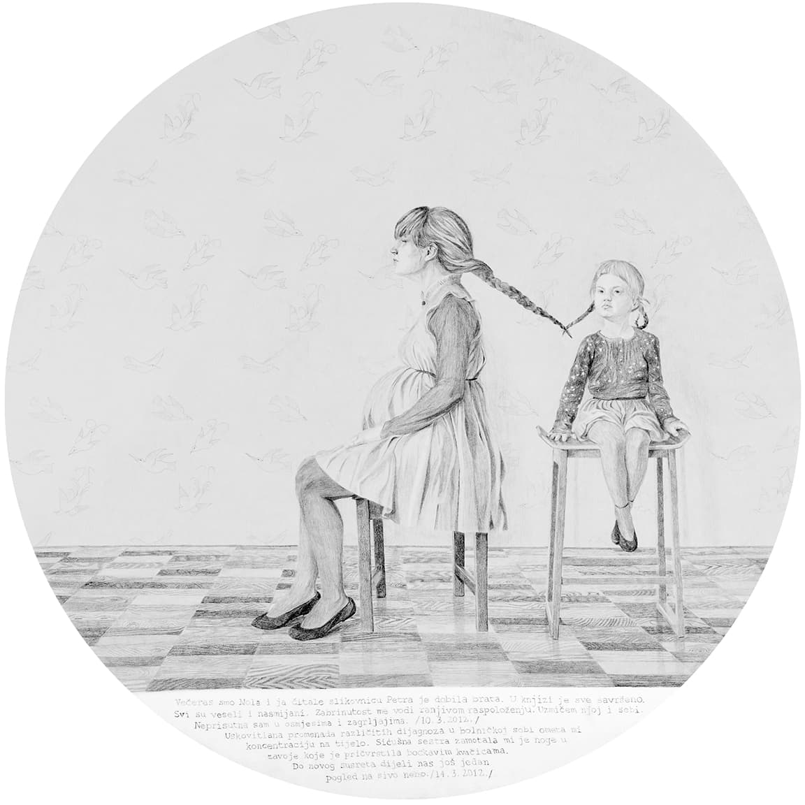 Intersubjektivnost i kontekst drugog stanja autoricu stavlja u poziciju za umjetničko istraživanje i djelovanje. Gravidnost postaje potencijal za kreativni govor u prvom licu. Time rad koji je usmjeren na vlastito stanje postaje način za samooslobađanja i djeluje terapeutski. Primijenjeno umijeće odličan je spoj čiji je rezultat devet self-imagea u devet različitih faza koje poput ogledala reflektiraju stanja koja umjetnica prolazi kroz trudnoću. Umjetnica uspostavlja diskurs sa samom sobom, a pokušavajući pronaći prostor za sebe, uspostavlja odnos s djetetom odnosno prema djetetu.